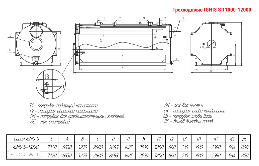 Технические характеристики водогрейного трёхходового котла ARCUS IGNIS S-12000