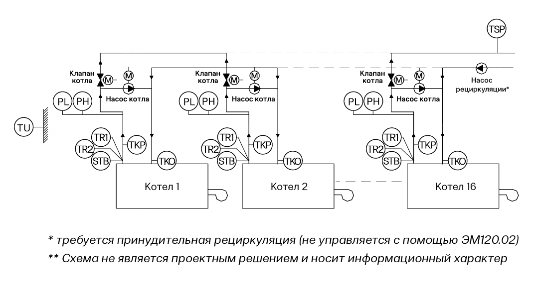 16 котлов, погодозависимое регулирование |